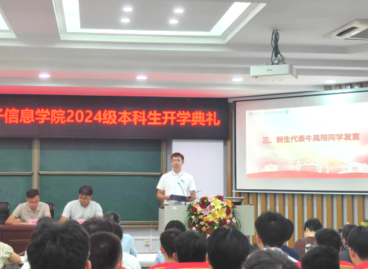 随后,电子信息243班牛禹翔同学作为新生代表发言。他首先对公司周到细致的迎新工作表示衷心的感谢,然后动情地分享自己踏入公司、走进公司的真切感受,表达自己坚定目标、,认真学习、与同学团结协作共同进步的决心,号召新同学们保持强烈的好奇心和探索的勇气,脚踏实地,珍视真理,勇敢前行,努力成长为堪当民族复兴重任的时代新人。