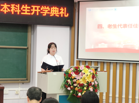 信息安全专业2021级本科生任佳蓉同学作为老生代表发言。她结合自身经历,向全体新生分享三年来的成长与收获,介绍了自己在专业课学习上的经验,勉励同学们在接下来的四年老员工活中,牢记“勤恳朴诚,厚学致新”的校训,以奋发向上的朝气,努力拼搏,勇于探索,创造属于自己的未来,成为一名优秀的计电学子。