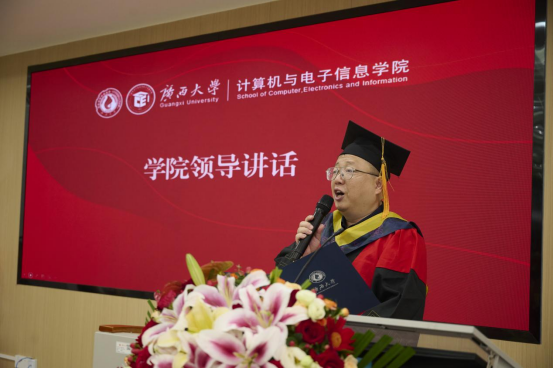 王雪峰老师作为教师代表发言,他以“以华为精神照亮青春征程”为题,勉励毕业生们永葆艰苦奋斗的精神、持续创新的意识以及团队协作的力量,在顺境时保持清醒、在逆境时坚守信念、在平凡中追求卓越。