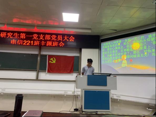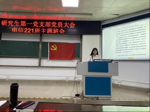 2022年9月27日,研究生第一党支部与本科生电信221班共同组织开展主题党日和主题班会。研究生第一党支部全体党员和电信221班全体同学参加会议,会议由研究生第一党支部副书记刘春雨同学主持。